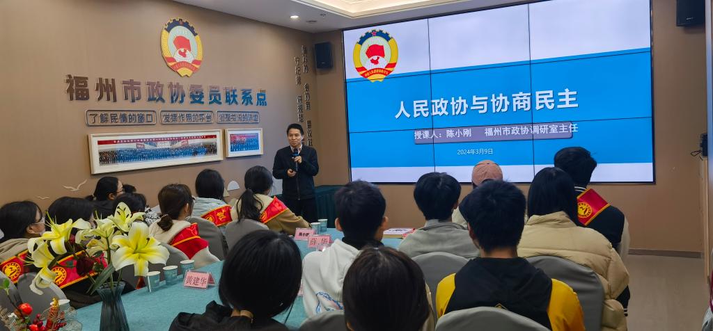 接着,市政协常委、市政协调研室主任陈小刚作《人民政协与协商民主》专题讲座,深入解读人民政协的性质、地位、作用及福州市政协协商民主实践,帮助师生志愿者们更好地理解国家的政治体系和发展方向。