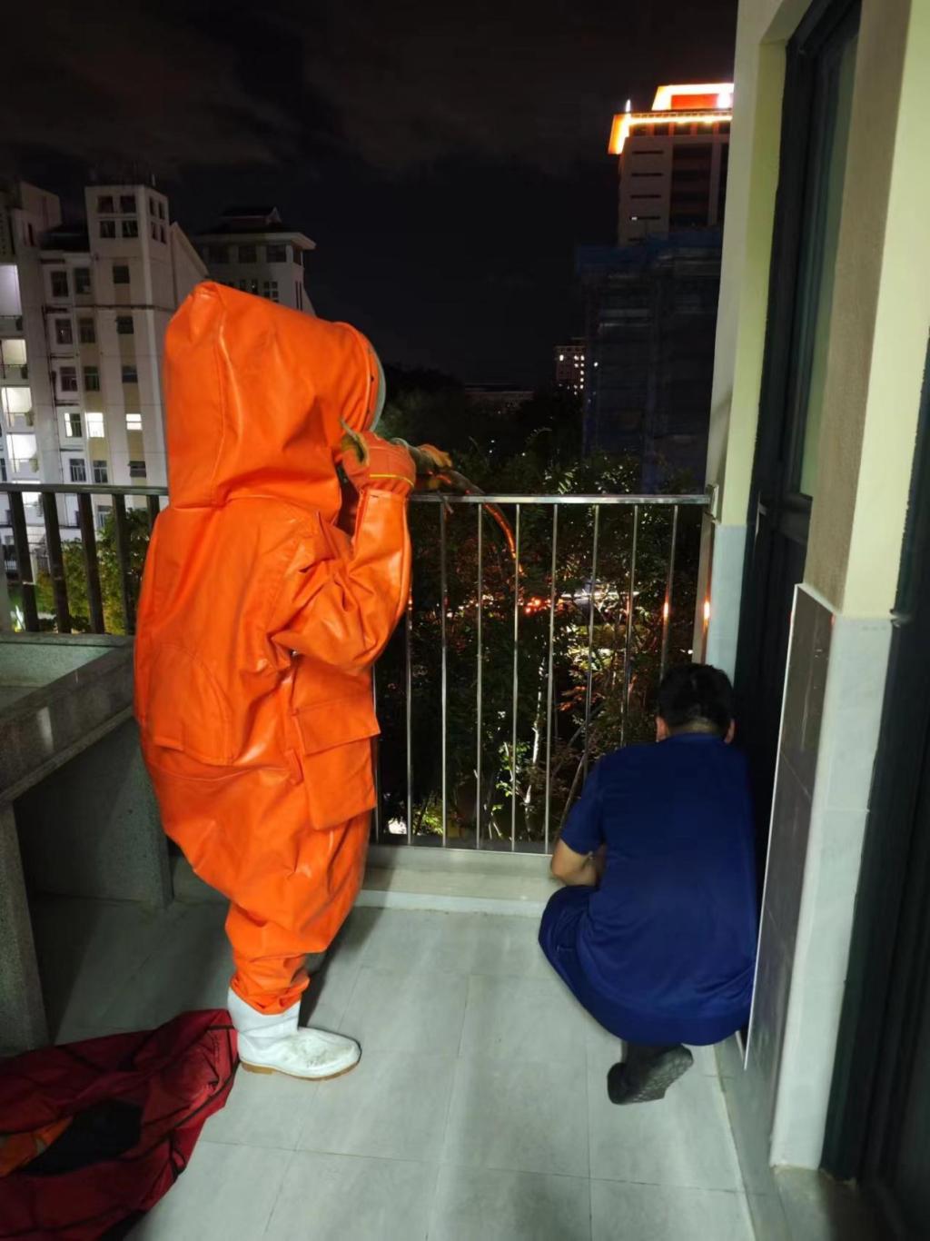 当天晚上,在通知附近宿舍学生关好门窗、做好现场警戒后,消防队员穿上防护服,戴上面罩,化身“清蜂侠”,来到就近的宿舍阳台上,手持长杆火把对准马蜂窝进行焚烧。在经过短暂火攻后,马蜂便被一窝端。为防止“漏网之鱼”再次筑窝扰民,消防队员还使用杀虫剂对蜂窝周围进行喷洒。