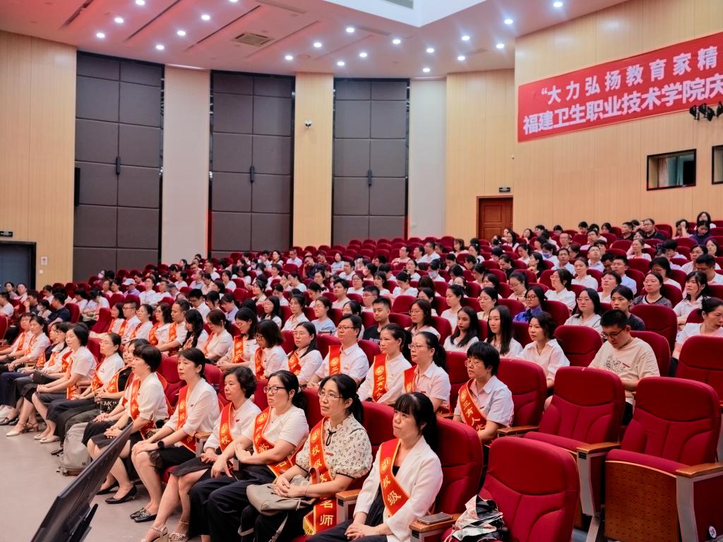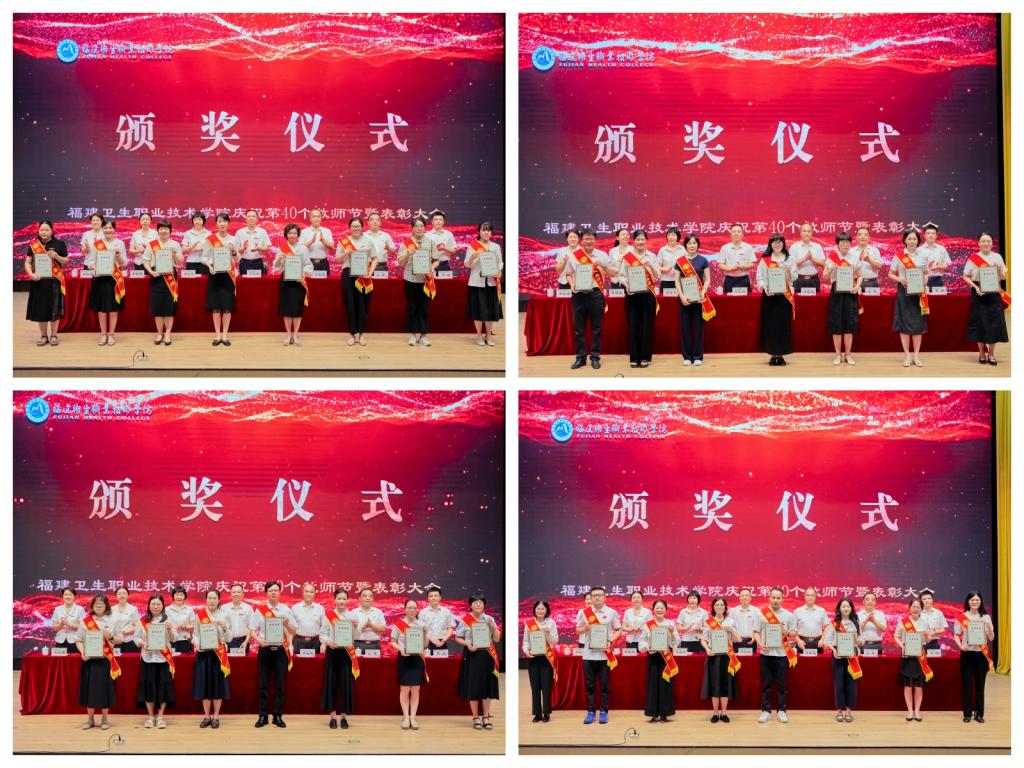 校长许能锋宣读2023-2024学年学校先进个人表彰决定。校领导为受表彰的校级“教学名师”“三育人先进工作者”“优秀青年教师”“优秀辅导员”和“优秀兼职教师”颁发证书并合影留念。