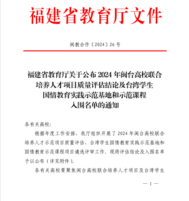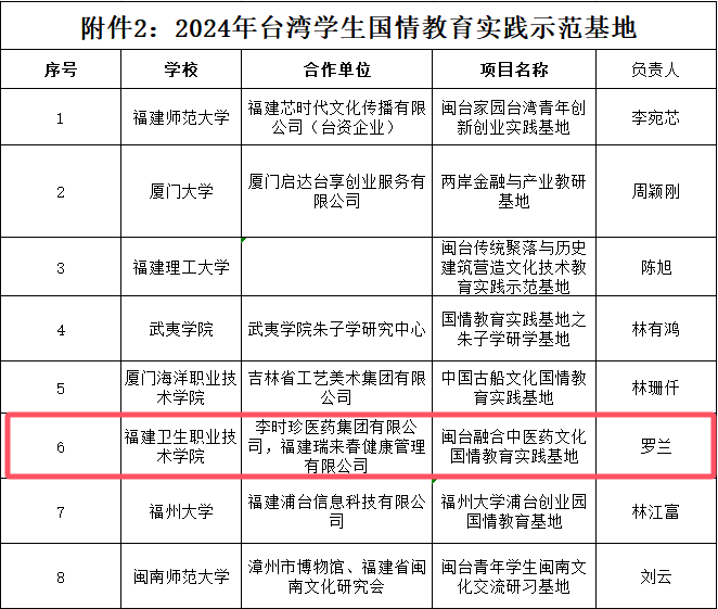 近日,福建省教育厅公布2024年台湾学生国情教育实践示范基地入围名单,全省共有8个示范基地入选。开云申报的闽台融合中医药文化国情教育实践基地获批台湾学生国情教育实践示范基地项目。
