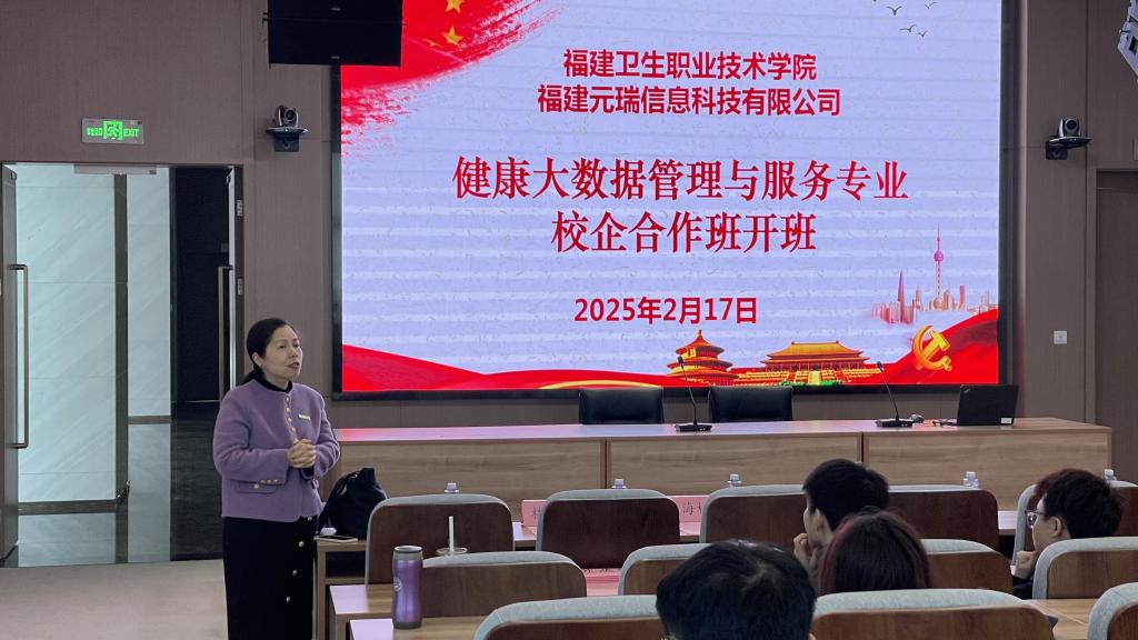 李美华代表学校对校企合作班的同学们表示祝贺,对福建元瑞信息科技有限公司给予的大力支持表示感谢。希望健康大数据管理与服务专业校企合作班的40名同学能珍惜学习机会,不断增长专业知识和技能,高质量完成学习任务,增强未来在社会工作中的竞争能力,不辜负学校和企业寄予的期望。