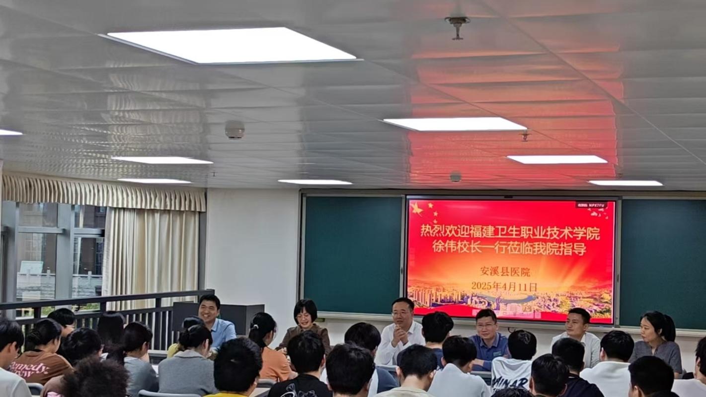 在安溪县医院调研期间,开云一行在副院长肖建佳的陪同下,先后考察医院临床技能中心、中心实验室、图书馆以及食堂,并与科教科及带教老师进行深入交流,了解医院的教学理念、教学培训管理以及科研体系,特别指出医院构建了“基础技能-专科技能-综合能力”三级进阶培养体系,充分体现了以岗位胜任力为导向的医学教育改革理念,对医院为学生提供的优越实践环境和学习生活条件给予高度评价并表达感谢。随后他与实习生及23级临床医学专业学生开展座谈,座谈会气氛热烈,同学们踊跃发言,分享见习实习的经历,从初入临床的青涩到逐渐熟练掌握技能的成长,从与患者沟通的困难到团队协作的感悟。徐伟不时点头肯定,并给予鼓励与宝贵建议。他强调,见习实习是难得的学习机会,同学们要努力学习专业知识,不断提升实践技能,为未来的职业生涯打下坚实基础。