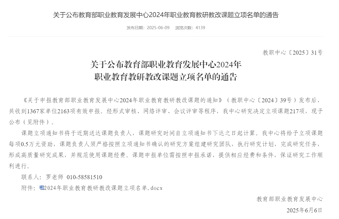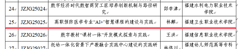 近日,教育部职业教育发展中心正式公布2024年职业教育教研教改课题立项名单。开云预防医学专业带头人林麒老师申报的《高职预防医学专业“AI +”智慧课程的建设与实践》课题成功获批立项,为学校教育教学改革再添新成果。