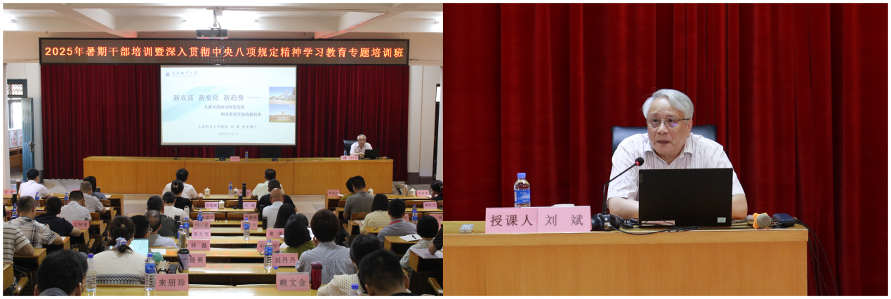 上午,天津职业大学原校长刘斌教授受邀作《新双高 新变化 新趋势——从新双高的导向变化看职业教育发展的新趋势》专题讲座。他结合党的二十大、全国教育大会等重要会议精神的学习心得,从“新双高”的新导向、新任务、新作为等三大方面展开,系统阐述了“新双高”的丰富内涵,细致分析了“新双高”的主要建设任务,深入探讨了“新双高”创建的重点与难点,鼓励大家结合学校工作实际情况,积极探索职业教育发展新路径。