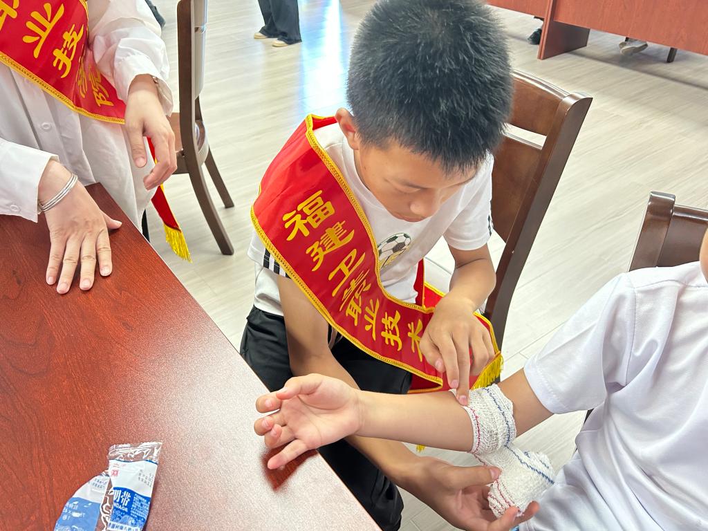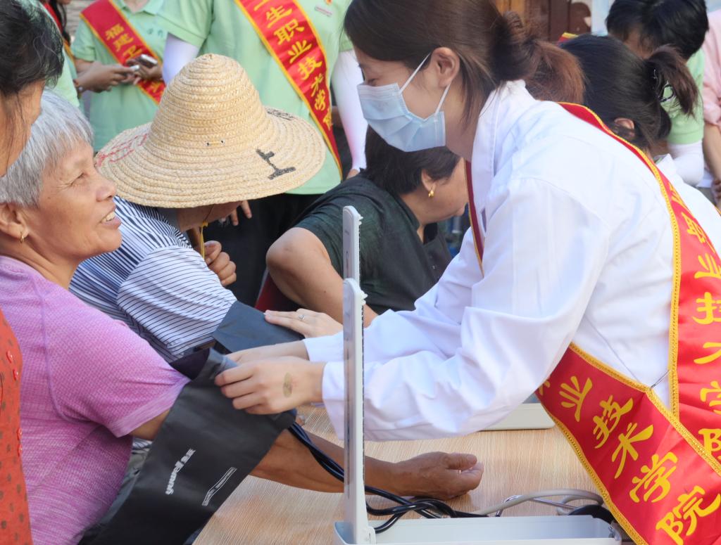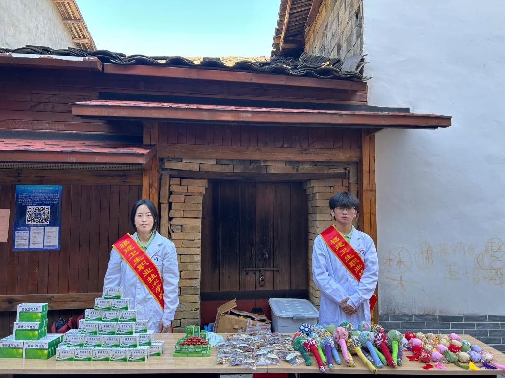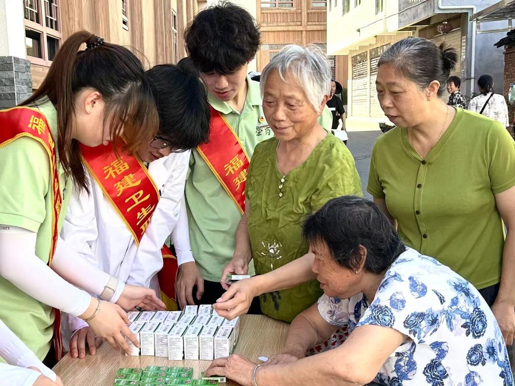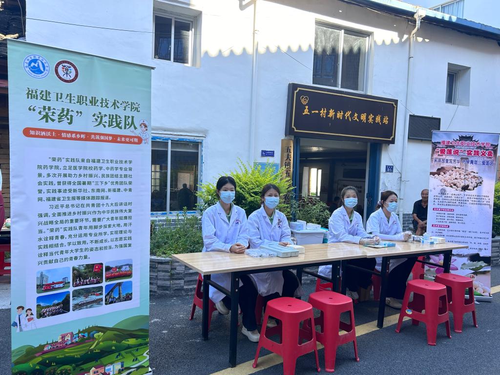 盛夏入五夫,“荣药”践初心。在五一村新时代文明实践站,“荣药”实践队分设血糖、血压义诊组,为130多名村民细致筛查健康隐患。现场发放自制中药香囊、艾草锤、文化宣传扇350多件,传递传统智慧。赠送藿香正气水等防暑药品、消暑花茶460多件,让中医药关怀浸润乡土。