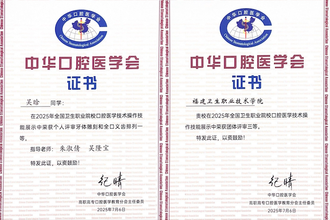 本次医学院派出23级口腔医学专业的3名选手,参加窝洞制备和双层全瓷牙预备、口内数字化印模制取和数字化固定桥修复设计、全口义齿排列和牙体雕刻三个模块的展示。经过激烈的角逐,3名选手分别荣获全口义齿排列和牙体雕刻一等奖(指导老师:朱淑倩、吴隆宝),窝洞制备和双层全瓷牙预备二等奖(指导老师:朱淑倩、童辉燕),口内数字化印模制取和数字化固定桥修复设计二等奖(指导老师:童辉燕、朱淑倩),并荣获团体三等奖的好成绩。