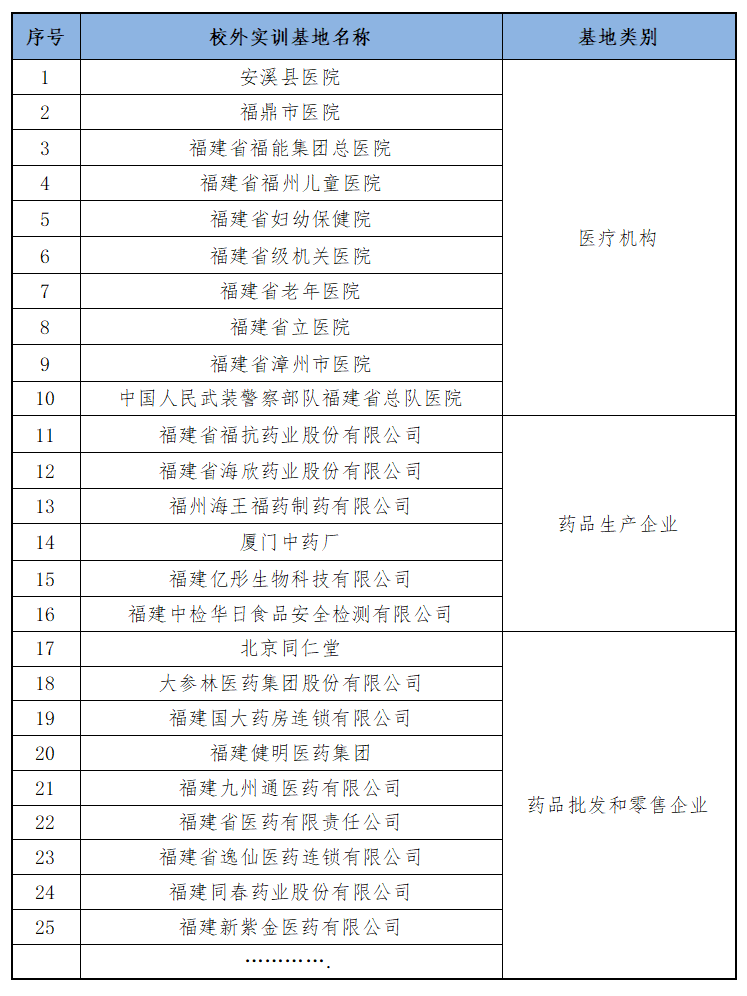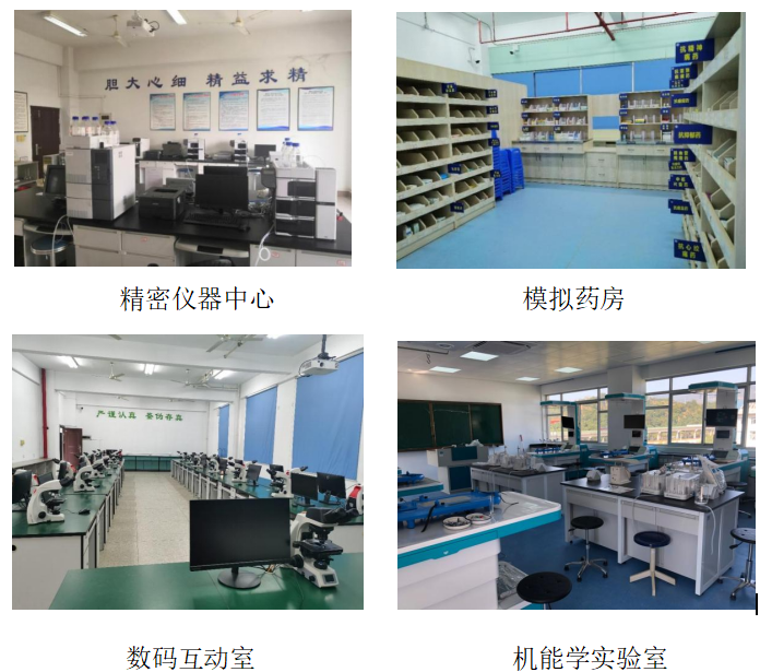 药学专业拥有配备设施先进、条件完善的中央财政支持的校内实训基地,由药物制剂实训车间、药剂实验室、药物化学实验室、药物分析实验室、精密仪器中心、模拟药房、模拟药店、机能学实训室等组成。拥有福建省立医院、福建同春药业股份有限公司、福州海王福药制药有限公司等76家医药卫生单位和社会药店校外实训基地,满足药学专业认识实习、岗位实习等教学要求。