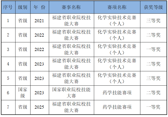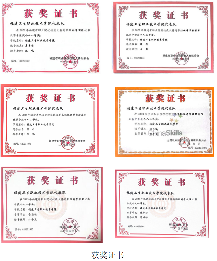 本专业积极组织学生参加各级各类职业院校技能大赛,近五年共获得化学实验技术竞赛一等奖1项,二等奖2项,三等奖2项。药学技能竞赛一等奖2项、二等奖1项。