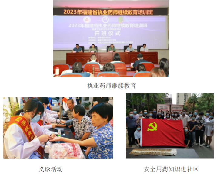 积极承担社会服务功能,面向社会、行业、医院(企业)开展技术技能培训。协助学校继续教育中心承担福建省执业药师继续教育培训班。依托党支部开展社会实践活动及团总支志愿服务队开展义诊志愿服务。专业教师利用专业知识,开展横向课题和成果转化,提升科技服务能力,部分科研成果实现转让收益。