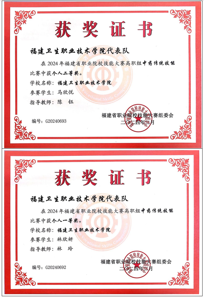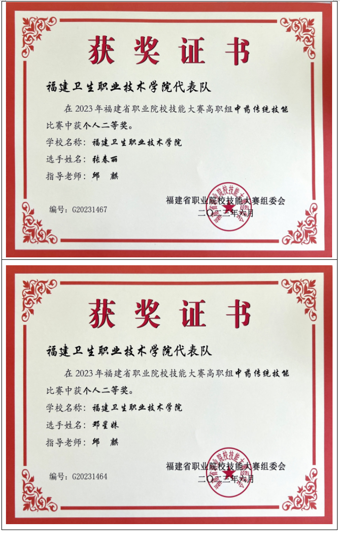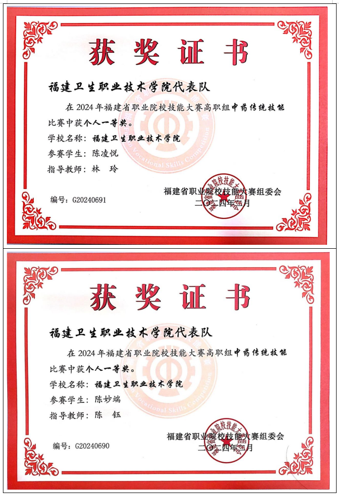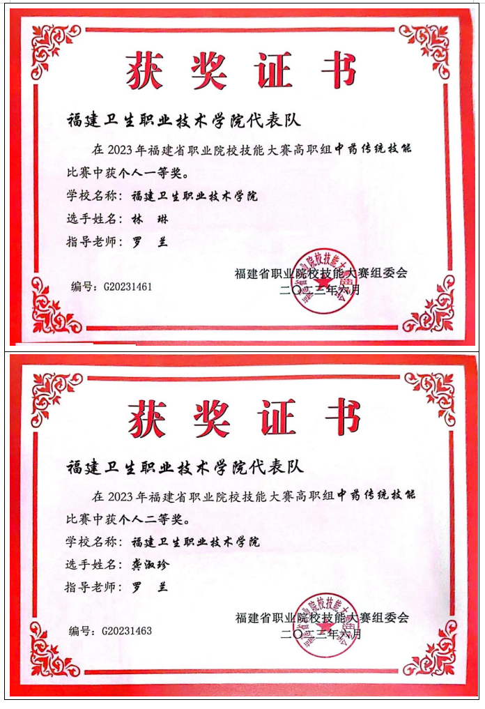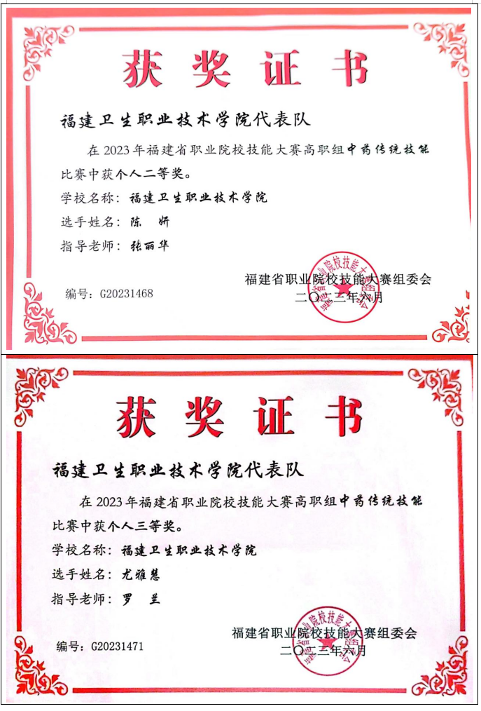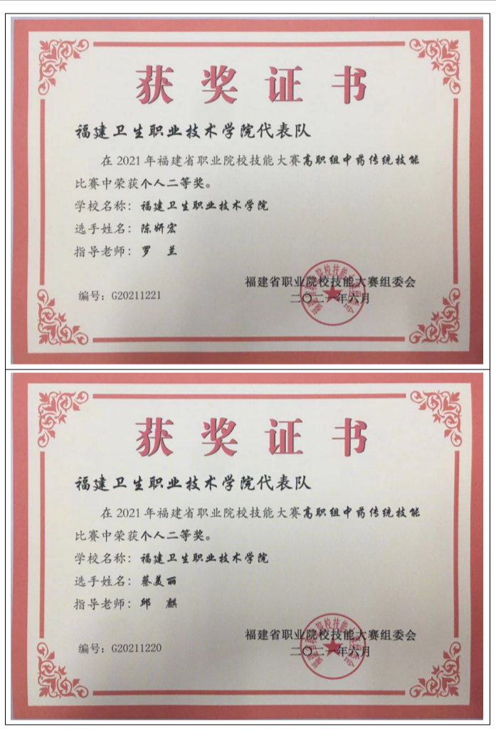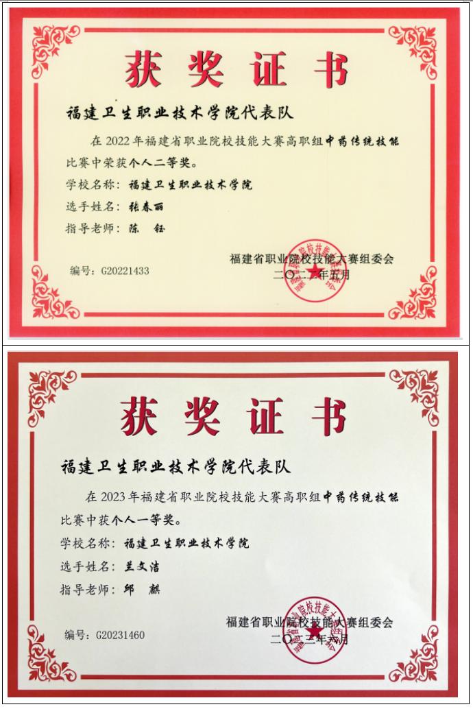 2012年起,专业教师指导学生参加中药传统技能竞赛共计获得全国一等奖2项,二等奖4项,三等奖 2项;省级一等奖10项,二等奖16项,三等奖13项。
