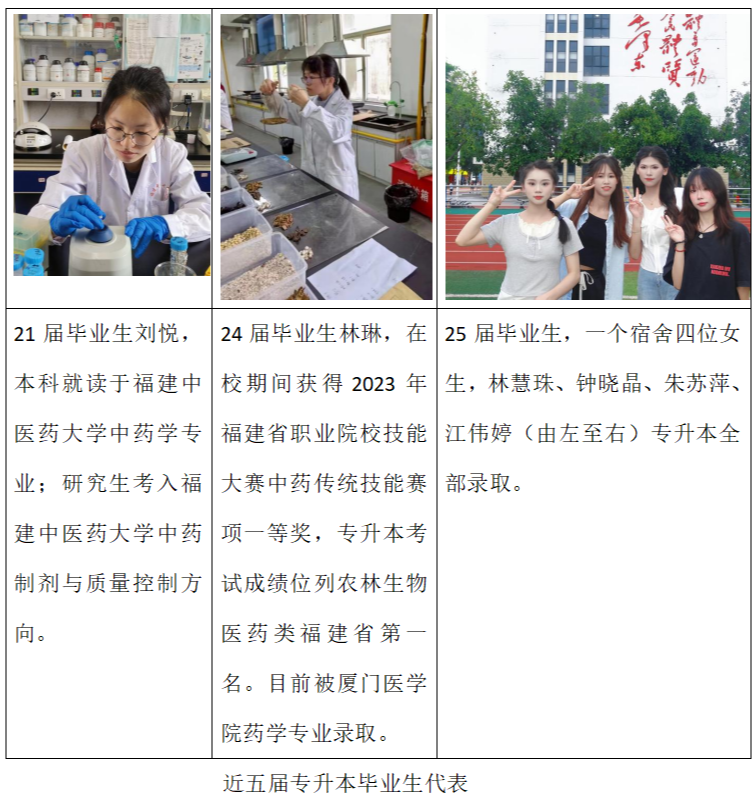 升学率:已培养12届毕业生,2020~2024年应届毕业生参加专升本考试录取率达15%以上。2025年中药学专业学生被本科高校录取人数30名,占比20%以上。