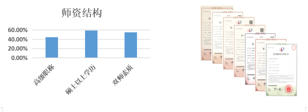 现有专任教师14人,其中高级职称6人;硕士及以上学历14人,其中博士2人。近年来教师获授权发明专利十余项,与企业联合申报科研项目5项,承接企事业横向课题12项;申报各类科研课题立项36项,厅级以上项目26项。