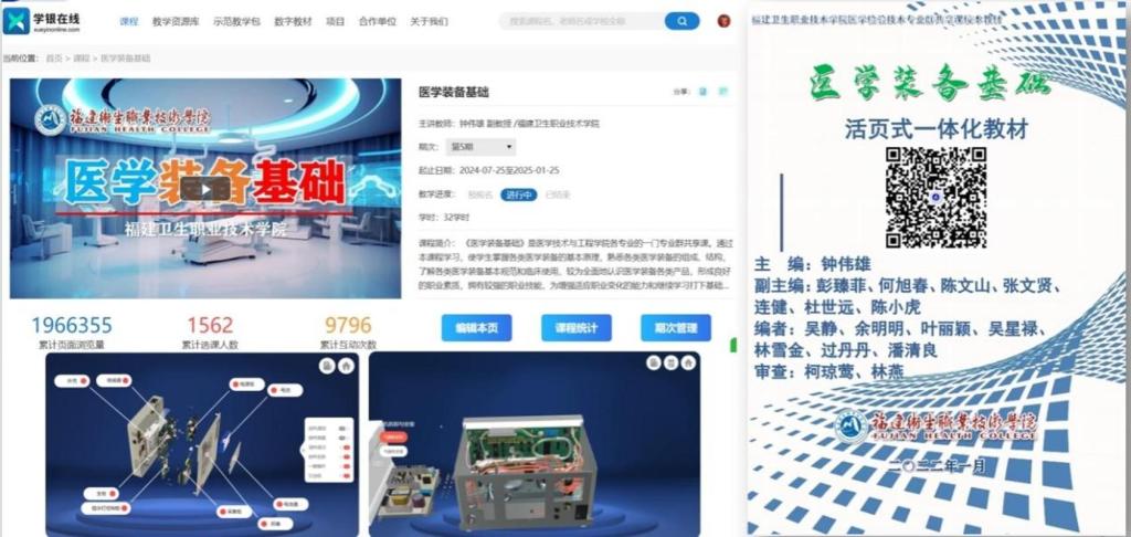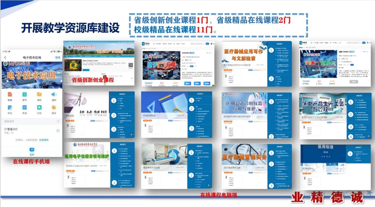 智能嵌入式控制技术、医用 X 射线成像技术及设备、CT 技术及设备、医用超声成像技术及设备、医疗设备质量控制与检测、医电产品组装与调试。建设有福建省省级职业教育智能医疗装备技术专业教学资源库。