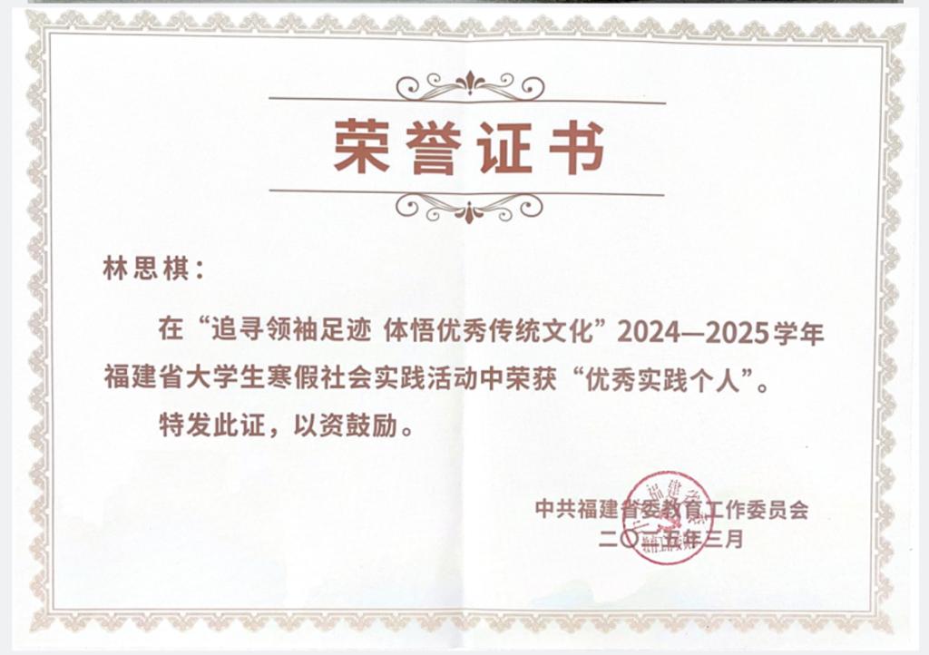 学生获福建省大学生寒假社会实践活动“优秀实践个人”