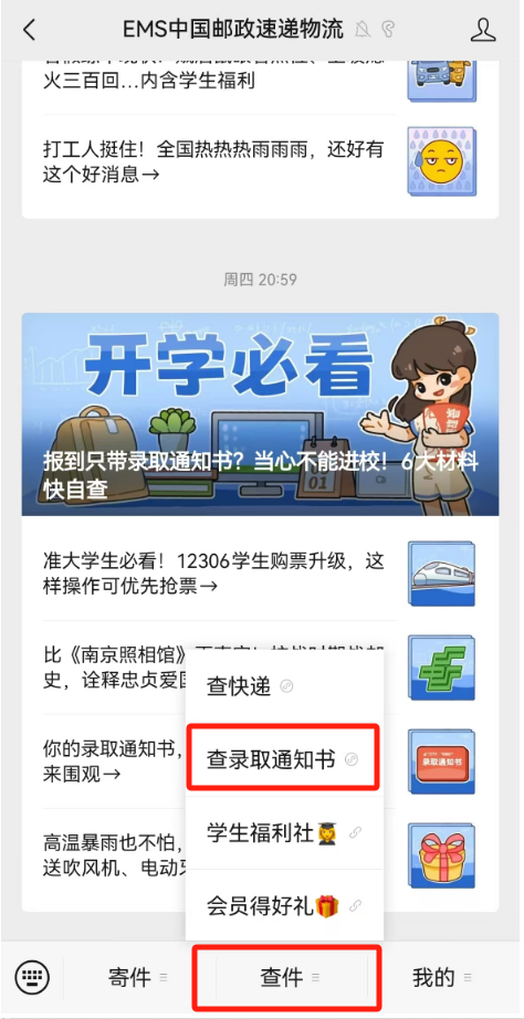 学校统一采用中国邮政EMS邮寄录取通知书,考生和家长可以通过微信搜索“EMS中国邮政速递物流”公众号,点击“查件”,选择“查录取通知书”,并根据提示输入考生号进行查询即可!