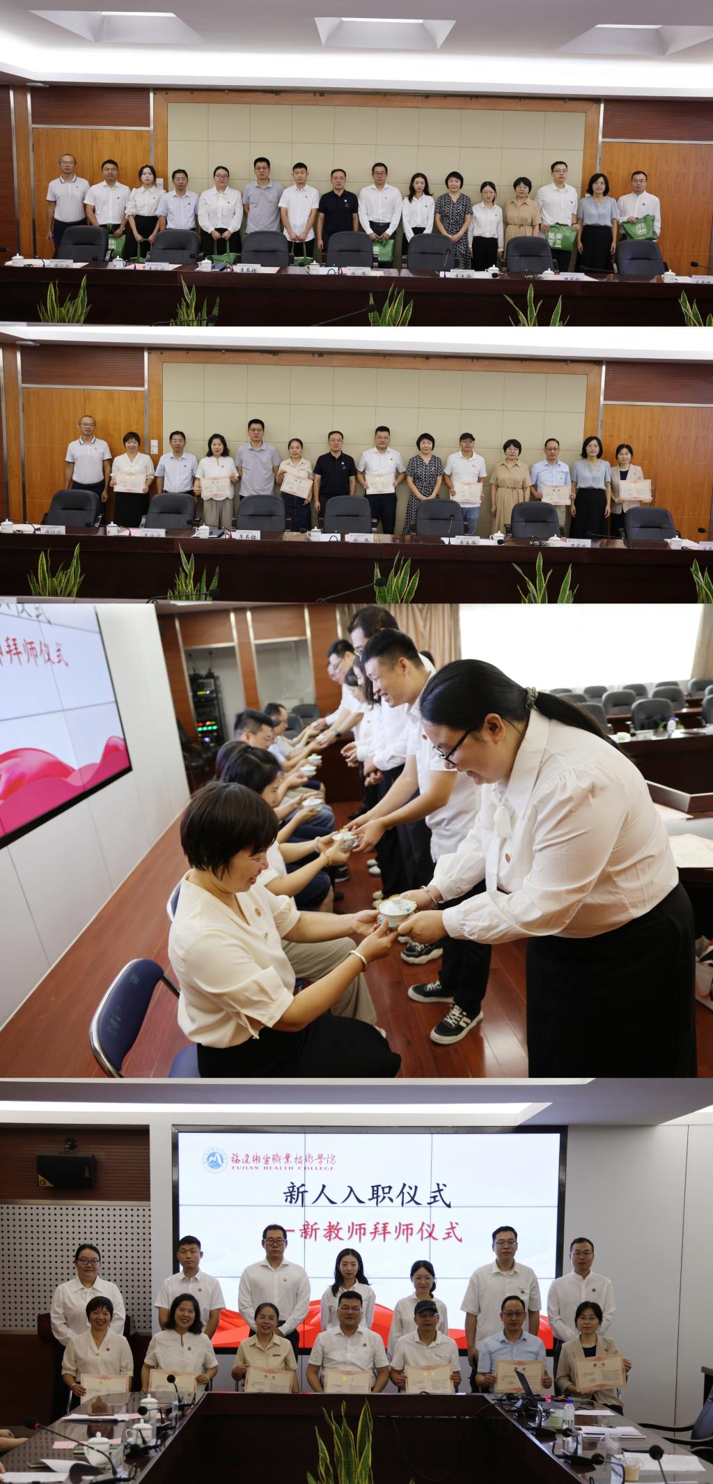 校领导及相关职能部门负责人共同为新教师佩戴校徽,发放了入职礼包,并为新教师导师颁发聘书,共同见证“师徒结对”的庄严一刻。