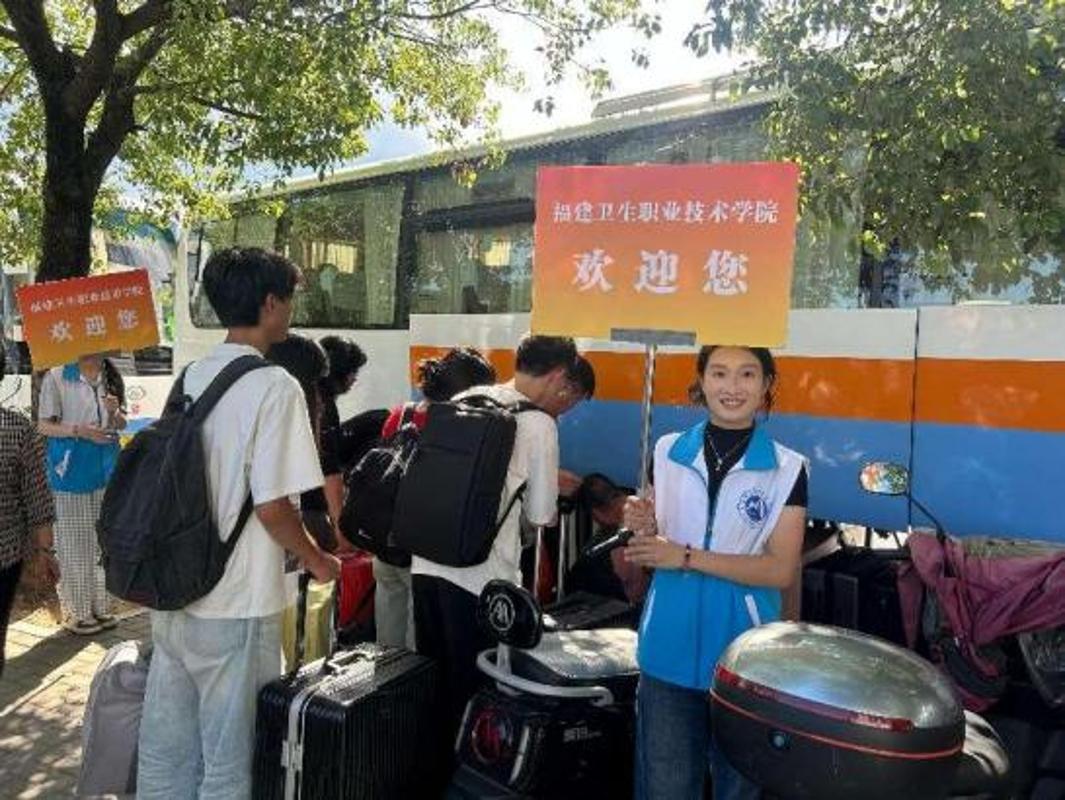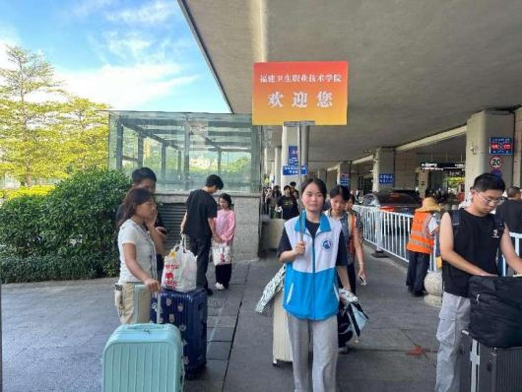 为方便新生到校,学校在福州火车站、福州南站设立了接站点,身着蓝色马甲的志愿者举着醒目的校牌,热情地引导新生乘车。