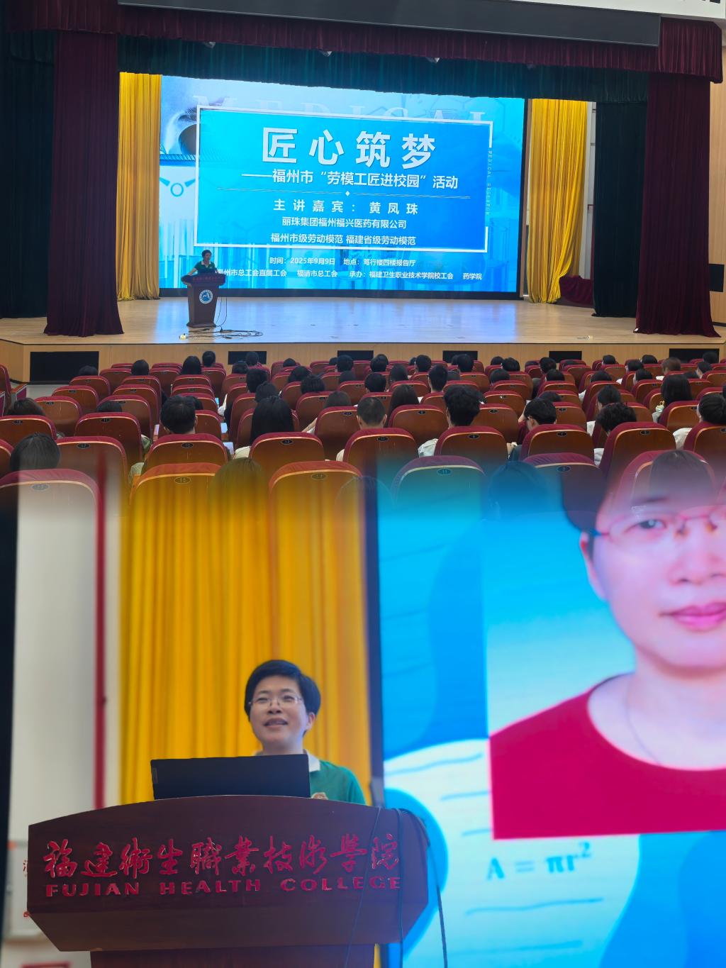 “匠心筑梦”环节将活动推向高潮。福建省级劳动模范、福州市劳动模范,丽珠集团福州福兴医药有限公司菌种中心经理黄凤珠走进校园,分享她从一线技术员到行业标杆的成长历程。她以朴实而有力的语言诠释了“工匠精神”——不是遥远的口号,而是每一天的坚守与热爱。同学们在她身上看到了药学人应有的担当与追求。