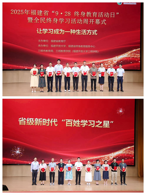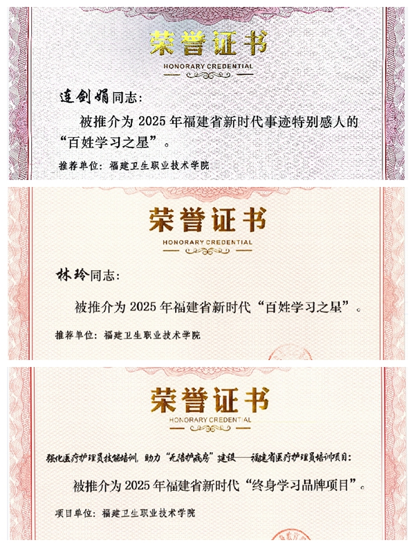 开幕式上,福建省教育厅举行表彰仪式,对2025年省级“百姓学习之星”与“终身学习品牌项目”的入选对象进行表彰。得益于前期在终身教育重点项目上的积极投入与建设,开云在此次表彰中取得了显著成绩:继续教育学院联合护理学院申报的“强化医疗护理员技能培训,助力‘无陪护病房’建设——福建省医疗护理员培训项目”荣获2025年福建省新时代“终身学习品牌项目”;护理学院连剑娟副教授、药学院林玲副教授荣获2025年福建省新时代“百姓学习之星”。