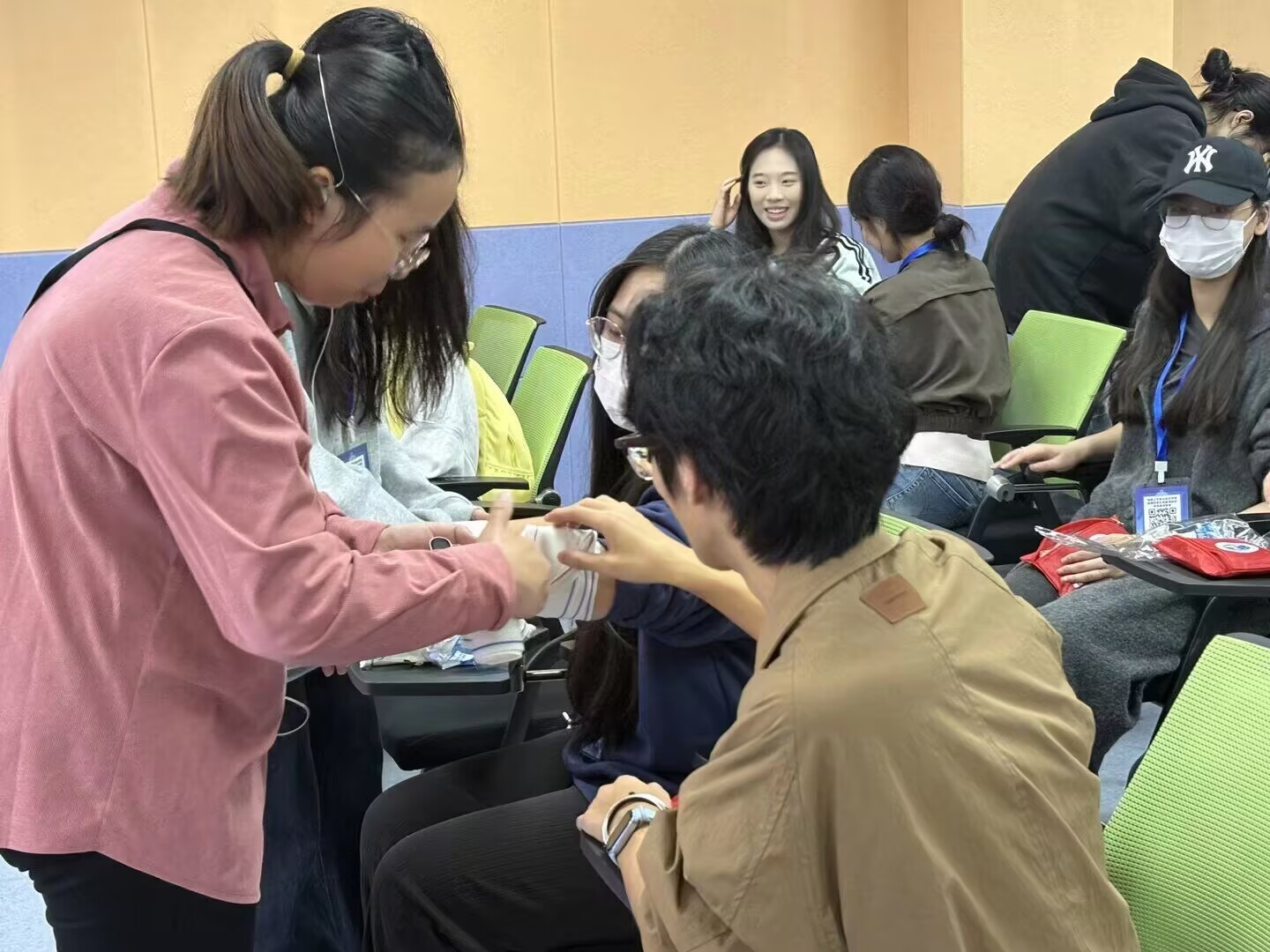 在红十字生命教育体验学堂的急救实训环节,重点聚焦绷带与三角巾包扎技能培训。专业指导教师立足医学原理,系统讲解包扎的生物力学依据与临床操作规范,细致拆解角度校准、松紧调节、特殊部位处理等标准化流程。师生围绕模拟擦伤、扭伤场景分组实操,针对性开展头、臂、腿等关键部位的包扎训练,在反复调整与实时纠错中熟练掌握急救要领。这一过程不仅夯实了大家的应急救护实操能力,更让“科学急救是生命防护第一道防线”的理念深入人心,为日常健康安全筑牢坚实保障。