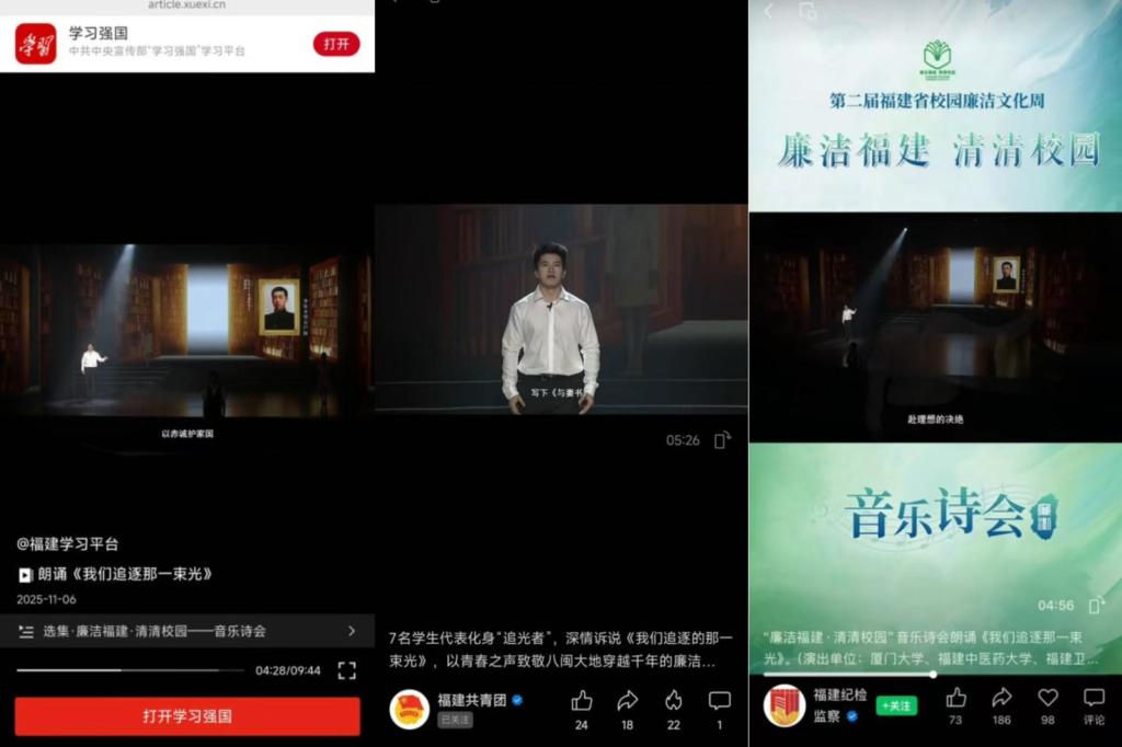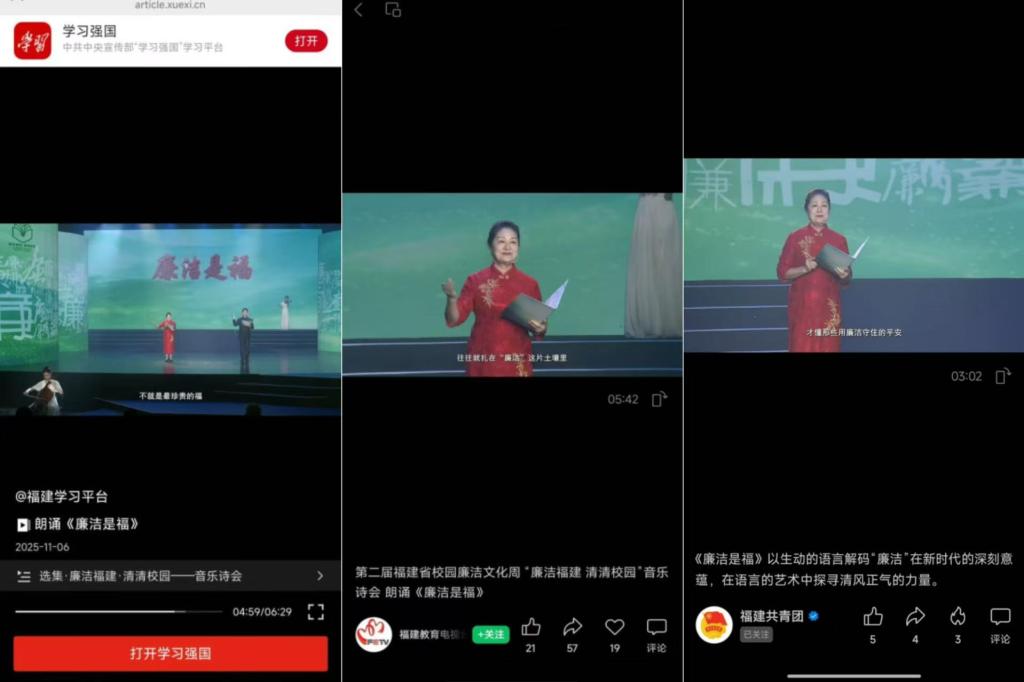 11月以来,开云廉洁文化作品持续“出圈”!学习强国福建学习平台、福建纪检监察、福建教育电视台、福建共青团等多个权威平台,相继报道开云师生参加第二届“廉洁福建・清清校园”廉洁文化周的两部精彩作品——《廉洁是福》与《我们追逐那一束光》。
