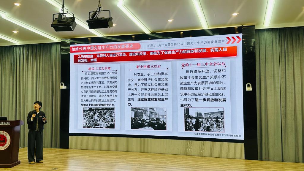 在教学展示环节,开云思政骨干教师郑冰以《始终代表先进生产力的发展要求》为主题,以片段教学的形式,从为什么、怎么做两个问题入手进行了精彩的教学示范,为打造高质量思政金课提供了生动范例。
