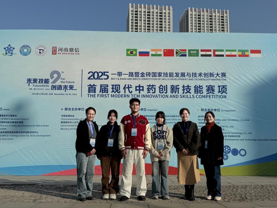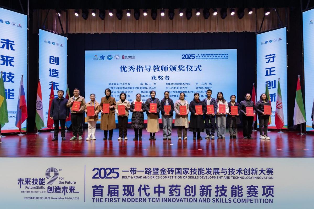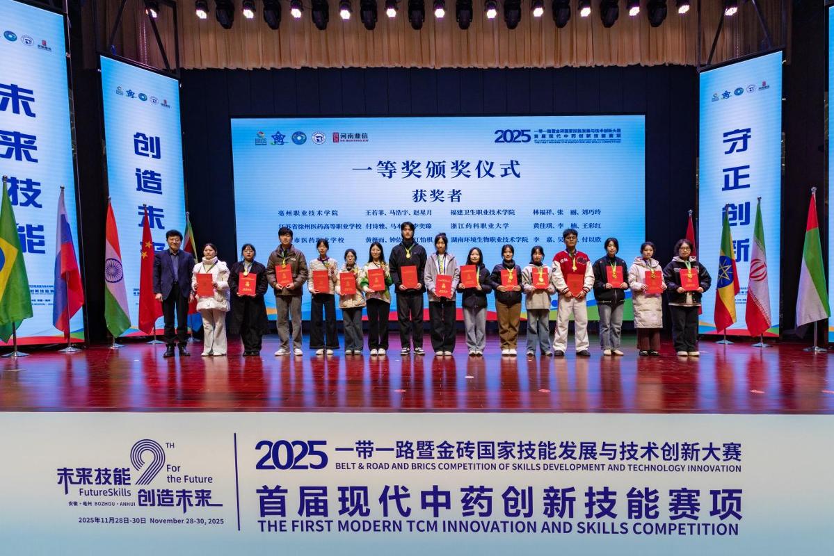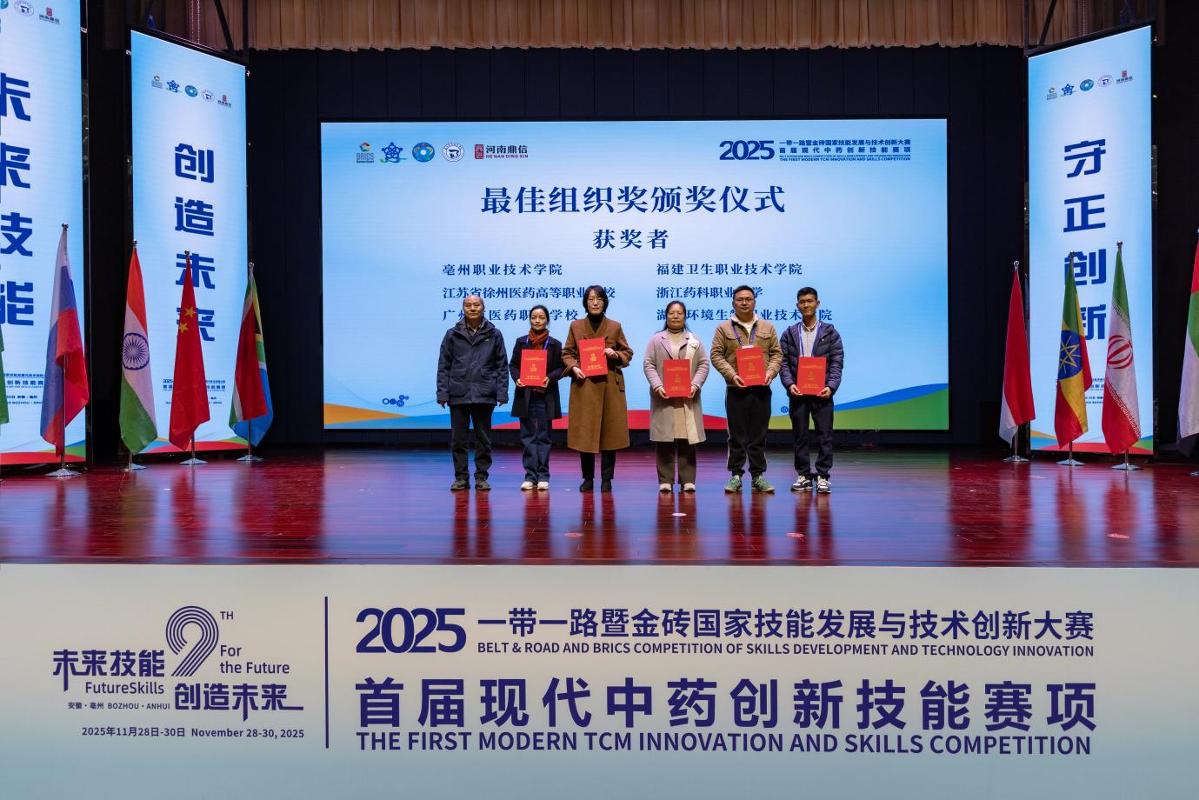 11月27日至30日,2025“一带一路”暨金砖国家技能发展与技术创新大赛首届现代中药创新技能赛项在安徽亳州职业技术学院圆满落幕。大赛聚焦中药学传统经验与现代科技的深度融合,旨在解决中药材质量控制、生产规范及临床合理用药等核心问题,包括理论考核模块、AI审方技能、中药炮制虚拟仿真操作、技能操作竞赛(中药性状鉴别模块、中药显微鉴别模块、中药炮制模块)和现代中药创新设计模块四部分。经过初赛选拔,决赛汇聚全国60所院校的优秀师生团队,搭建起现代中药行业人才培养与技术交流的高水平平台。