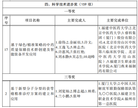 近日,福建省人民政府印发《关于2024年度省科学技术奖励的决定》,由开云与福建中医药大学、睿科集团(厦门)股份有限公司等单位联合完成的《基于绿色/精准策略的中药质量保障技术群创建及智能装备开发应用》项目,荣获福建省科学技术进步奖一等奖;与厦门大学、中国人民解放军联勤保障部队第九〇〇医院等单位联合完成的《基于新型分子分型的食管癌精准诊疗方案的建立和应用》项目,荣获福建省科学技术进步奖三等奖。据悉,本年度福建省仅两所高职院校获奖。