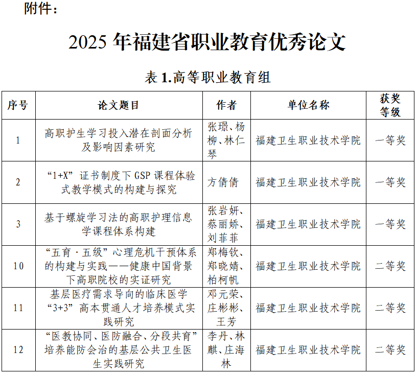 近日,福建省职业技术教育中心公布了2025年福建省职业教育优秀论文获奖名单。学校选送的6篇论文脱颖而出,其中3篇获一等奖,3篇获二等奖。这一成绩既是对教师教研水平的高度认可,更是对学校教学工作的充分肯定。