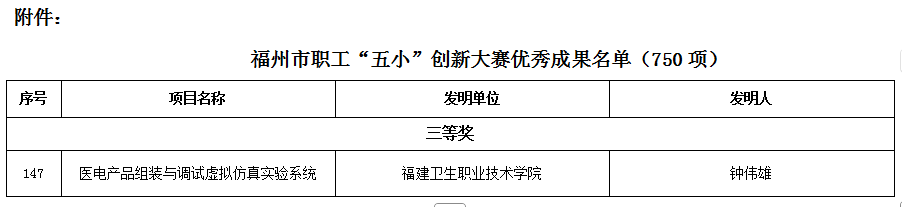 近日,福州市总工会发布《关于确定2025年福州市职工“五小”创新大赛优秀成果的通知》,开云医学技术与工程学院钟伟雄老师主持开发的《医电产品组装与调试虚拟仿真实验系统》从3688个参赛项目中脱颖而出,荣获2025年福州市职工“五小”创新大赛优秀成果三等奖。