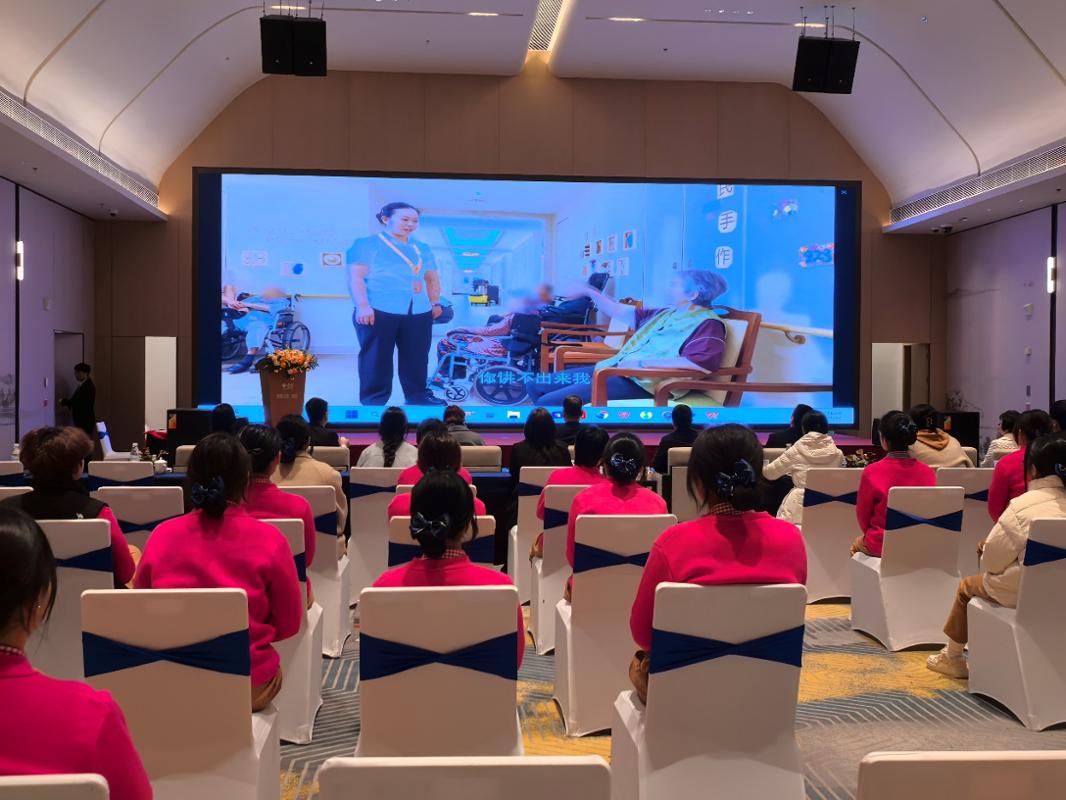 开班仪式前,全体人员集中观看认知症照护主题微电影《陪你老》。影片真实还原了认知症老人记忆衰退、情绪波动的日常状态,细腻刻画了家属长期照护中的无助困境,生动展现了泰康工作人员以专业与温情开展照护的场景。真挚情节直击人心,不少师生深受触动,悄然落泪,进一步深化了对认知症照护行业使命与温度的认知。