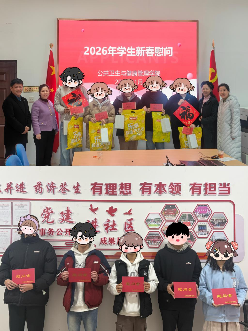 药学院、公共卫生与健康管理学院分别开展2026年新春座谈会。学院领导、辅导员与学生代表亲切交流,细致询问同学们在校学习生活情况,认真倾听大家的实际需求与意见建议。与会家庭经济困难学生代表汇报了他们的学习生活和获奖资助情况,表达了对党和国家资助政策的感恩,对学校关心、关爱与关怀的感谢。学院向困难学生发放暖心物资,并送上新春祝福。