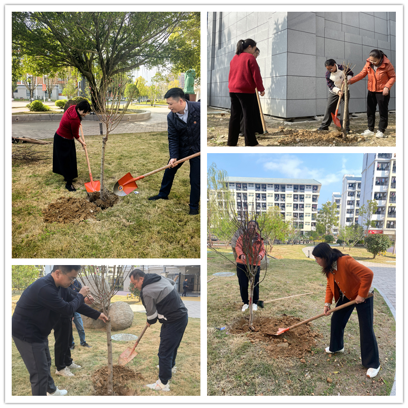 活动现场气氛热烈,校领导与教职工分工协作,配合默契,大家挥锹铲土、扶苗培土、提水浇灌,合力栽下红梅、红枫等苗木,一棵棵新栽苗木迎风挺立,在春日暖阳中展现勃勃生机。