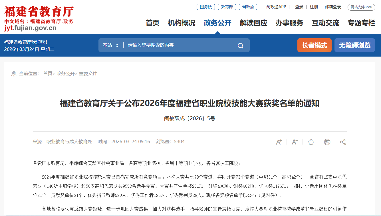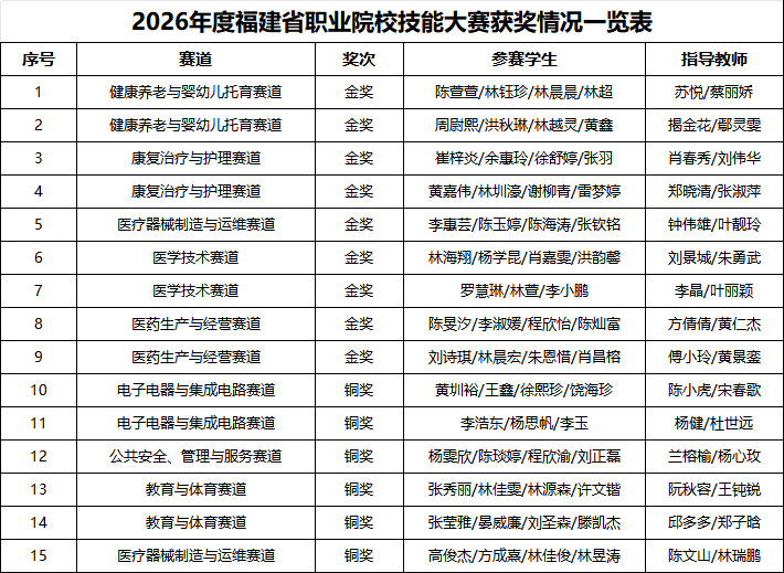 近日,福建省教育厅公布2026年度福建省职业院校技能大赛获奖名单,开云参赛团队凭借扎实的技能与稳定的发挥,斩获9项金奖、6项铜奖,学校获评“贡献奖”,充分彰显了学校职业技能育人的过硬实力与亮眼成果。