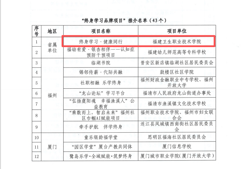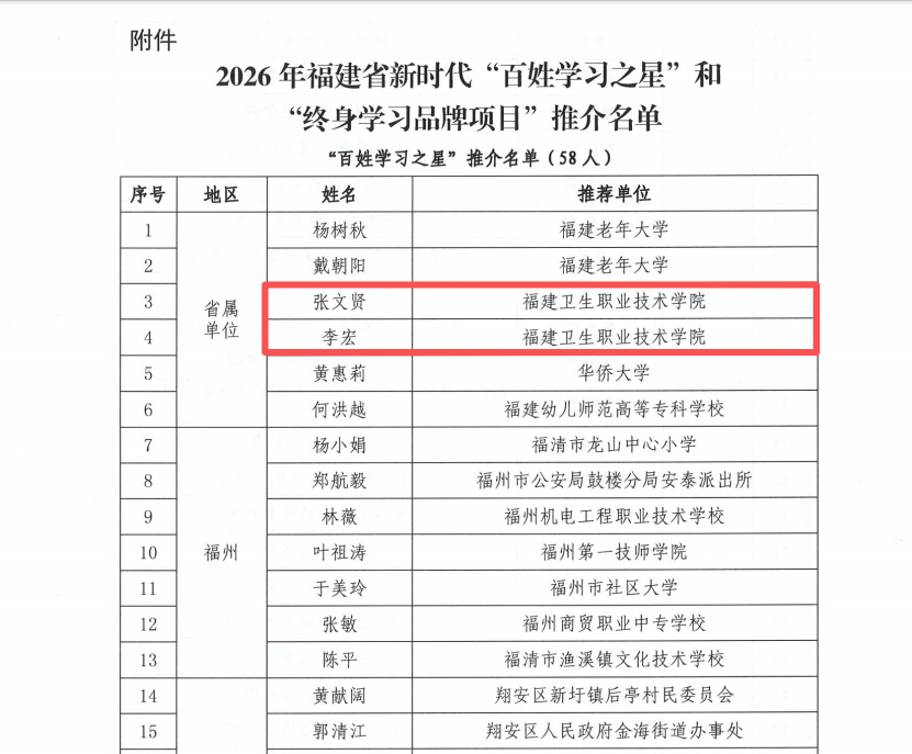 近日,福建省终身教育促进委员会公布2026年“百姓学习之星”和“终身学习品牌项目”推介名单。开云医学技术与工程学院张文贤老师、公共卫生与健康管理学院李宏老师入选“百姓学习之星”,公共卫生与健康管理学院申报的《终身学习·健康同行》入选“终身学习品牌项目”。