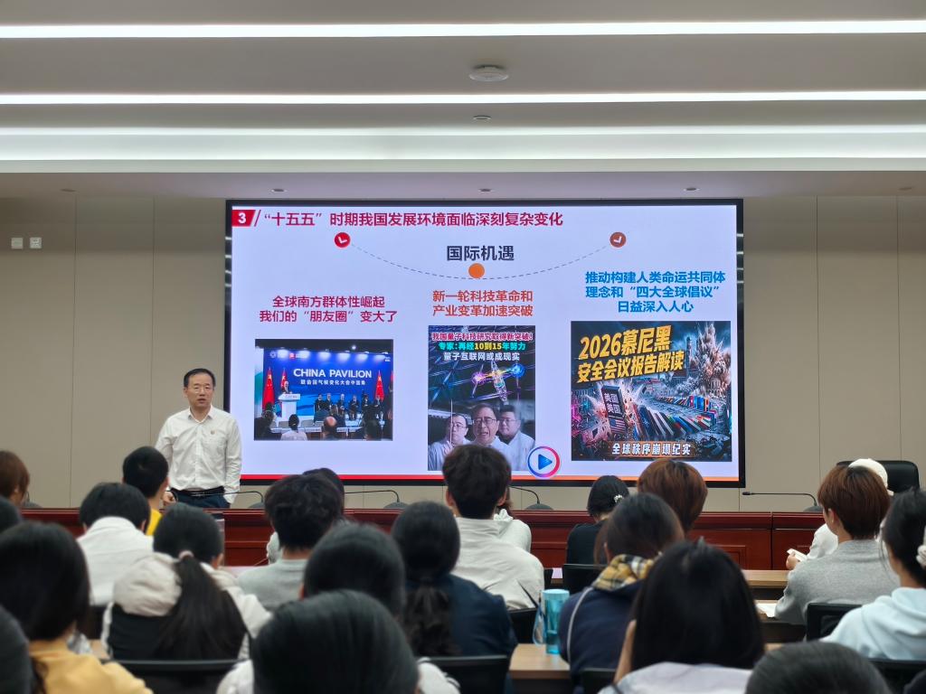 徐伟围绕制定实施五年规划是党治国理政的重要方式、“十五五”时期我国发展所处的历史方位、“十五五”时期经济社会发展的战略部署、确保基本实现社会主义现代化取得决定性进展四个方面,用详实数据、鲜活案例、直观对比,全面回顾“十四五”时期我国在经济发展、科技创新、民生改善、生态文明等方面取得的历史性成就,深入分析“十五五”时期我国发展面临的机遇与挑战,清晰阐释这一时期在基本实现社会主义现代化进程中承前启后、开局起步、全面收官的关键定位。同时,结合药学、口腔医学专业特色与健康中国建设需求,引导同学们清晰认识个人成长与国家现代化、行业发展同频共振的紧密联系,鼓励大家立足专业、苦练本领,在服务人民健康、助力健康中国建设中实现人生价值。