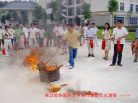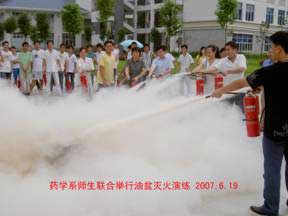7.公基部、药学系在保卫处的配合下、各系领导亲临的组织下分别在5月29日和6月19日举行由全体老师和学生会干部、舍长参加的联合灭火演练。