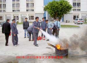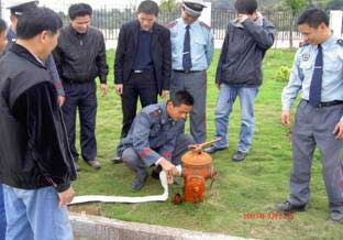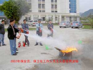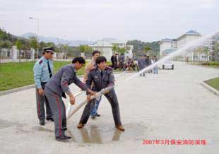 3.2007年3月27日保卫处组织全体保安员和安防人员举行油盆灭火演练和消防水带操作演练。