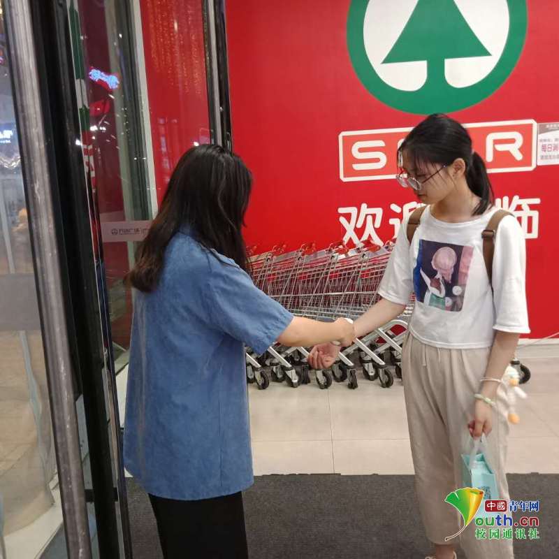 图片发自中青校园App(图为李文静在商场为路人测量体温。 中国青年网通讯员 李文静 供图)