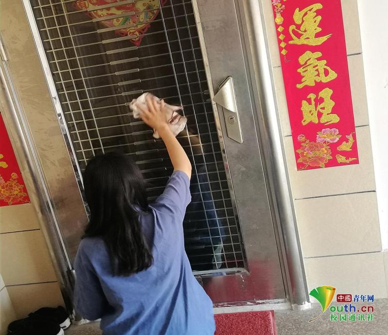 图片发自中青校园App(图为李文静在社区打扫门户。 中国青年网通讯员 李文静 供图)