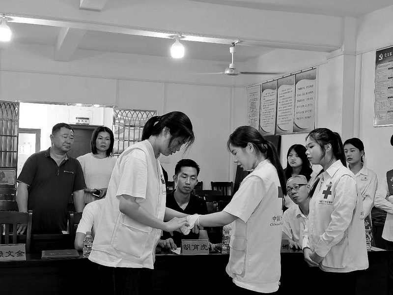 图为该校红十字会学生为归侨眷作心肺复苏、海姆立克急救法和常见伤口绷带包扎的演示讲解。 (熊美兰 罗芸图/文)