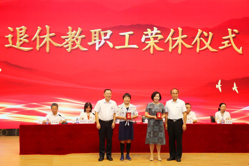 随后进行了教职工荣休仪式,曾武祈、许能锋为退休教职工代表郑韵芳、蔡丹凤2位老师颁发了“光荣退休纪念章”,代表学校向她们及全体离退休教职工致以衷心感谢和崇高敬意。