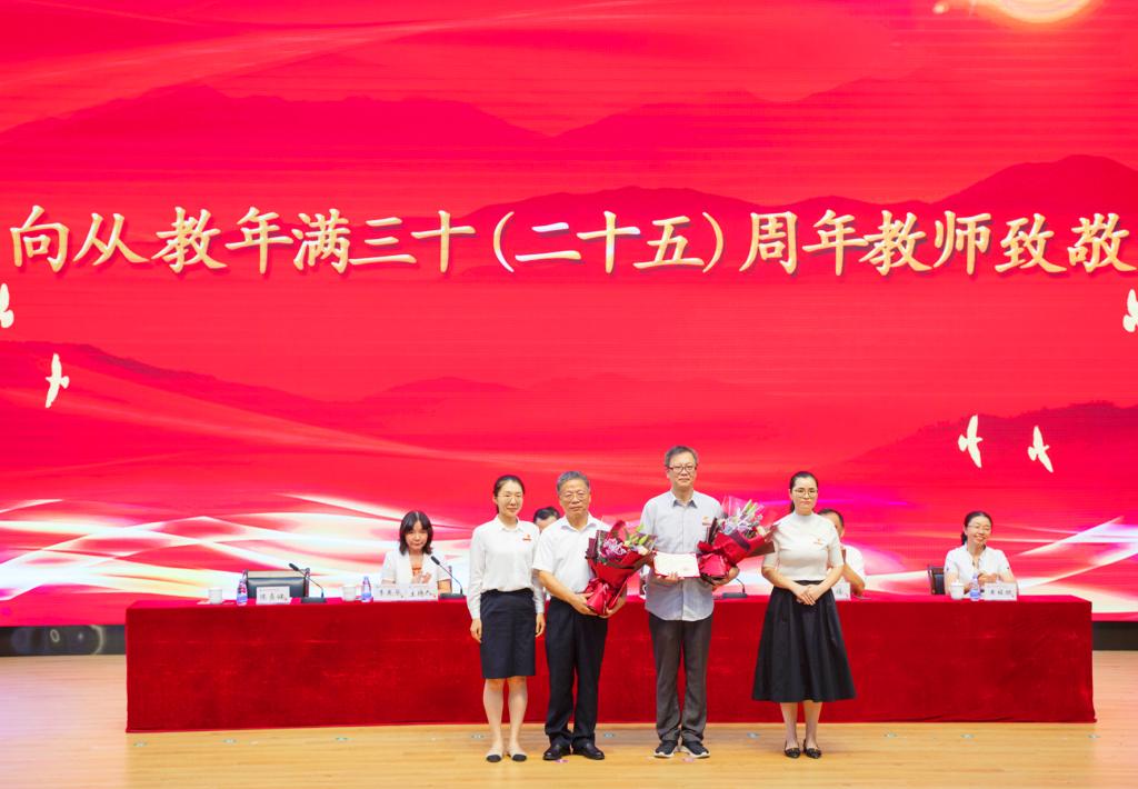 曾武祈和许能锋还为获得从教满三十年周年的教师代表陈贞健、廖伟坚2位老师颁发证书,以掌声和鲜花向所有在教育事业默默躬耕、无私奉献的教师致敬。