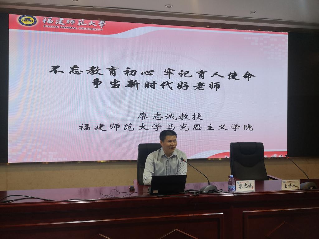 在思想政治教育专题讲座中,福建师范大学廖志诚教授以“不忘教育初心,牢记育人使命——争当新时代好老师”为主题,深入阐述了“四有”教师的深刻内涵,他表示,青年教师要多奉献,多付出,用心育人,以爱育才。