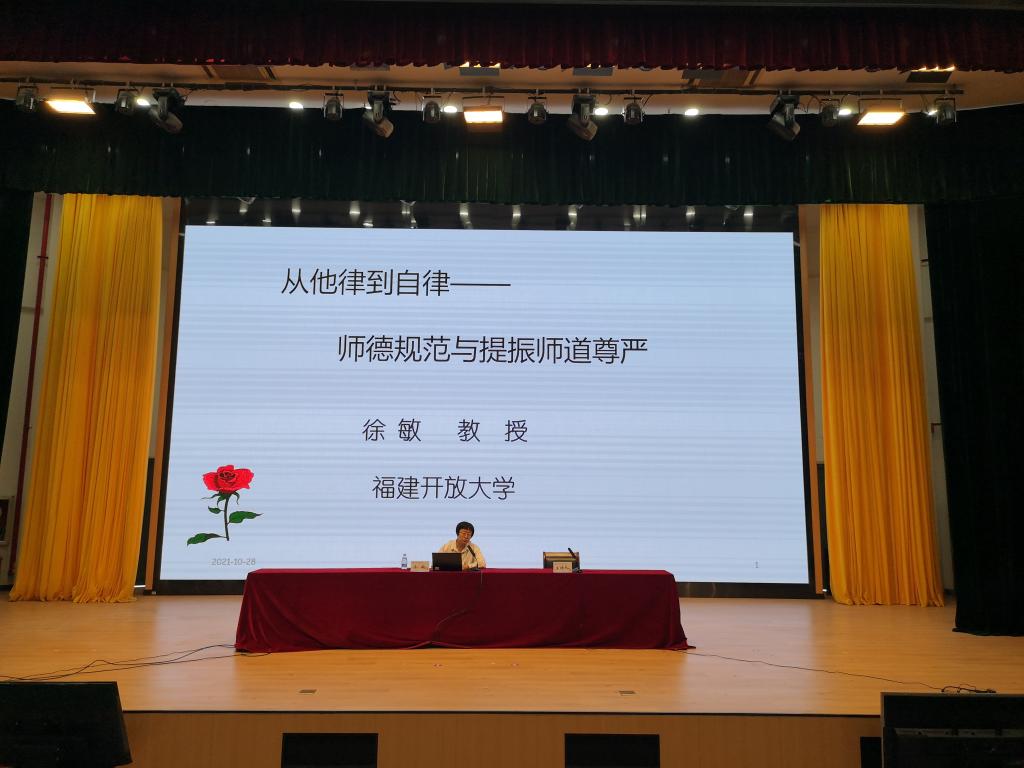 在师德师风专题讲座中,福建开放大学徐敏教授以“从他律到自律——师德修养与提振师道尊严”为主题,从教育部相关文件的重要意义及身边的师德典型入手,分析教师职业规则和特点,并从师爱、师业、师能、师德、师魂五个方面具体阐述教师价值定位和要求。她强调,师有道,师有德,师有则才是一名教师最理想的状态,才能最终体现教师的幸福感。