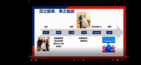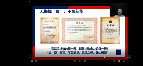 接着,危艳萍向大家生动细致的分享自己的“从战”经历,2020年2月12日递交请战书,2月13日晚接到第二天就要出发武汉的通知,疫情就是命令,防控就是责任,她和众多医护工作者一样,毫不犹豫的踏上奔赴武汉的战场。刚到武汉时,防护物资还很紧张,没有靴套就用医疗垃圾袋,外科手套不足就用检查手套,到后来防护物资才逐渐充裕。令危艳萍最难忘的还是穿着防护服每天工作7、8个小时,衣服干了又湿,湿了又干。防护口罩勒的耳朵感觉快要掉了,护目镜压得鼻梁、颧骨持续疼痛,厚厚的防护服闷得她喘不上气。那些平时简单轻松就能完成的工作变得困难重重,干什么都有费力感。人也容易疲劳,有一次蹲下休息,差点站不起来,但忙起来所有的不适也就忘了。