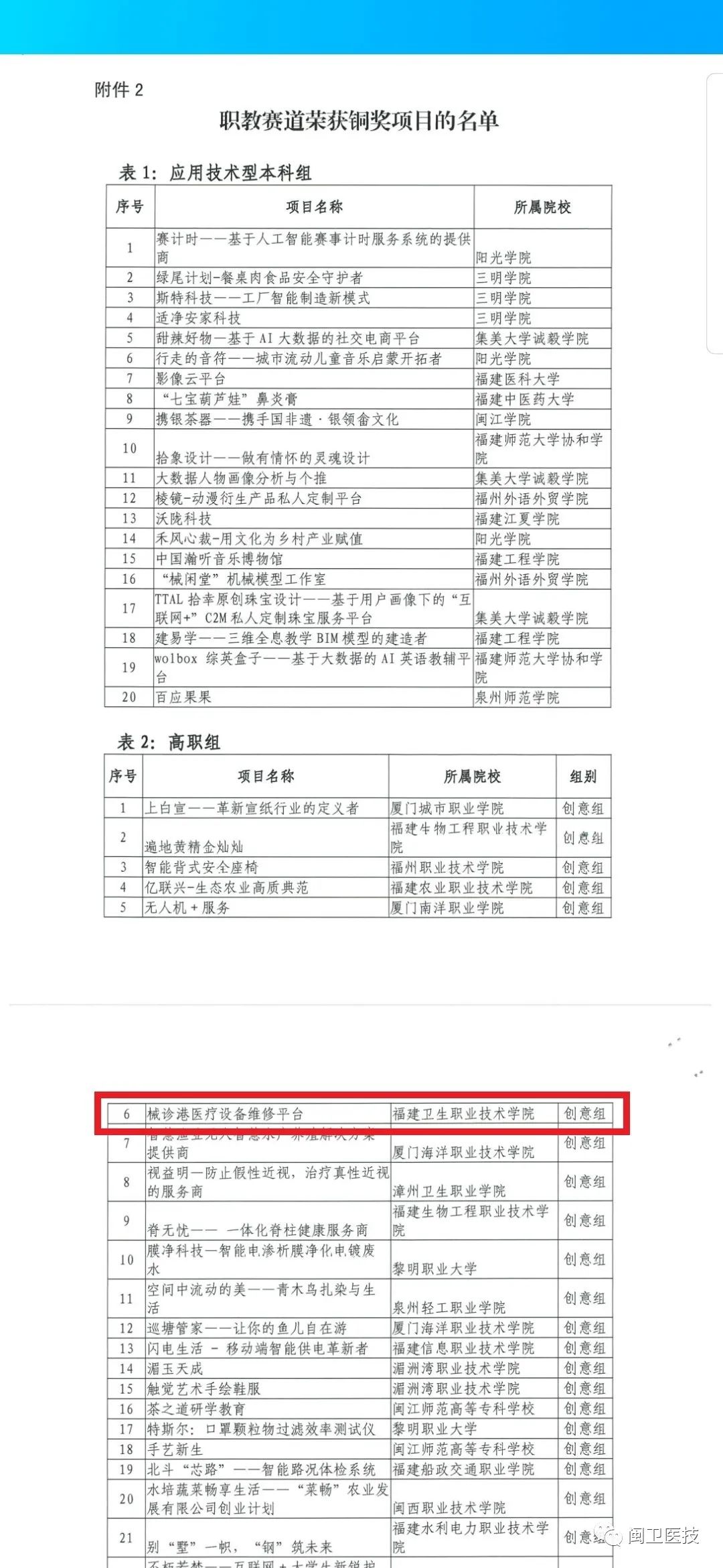 2020年8月31日,第六届福建省“互联网+”大学生创新创业大赛职教赛道暨第四届黄炎培海峡职业教育创新创业大赛省级初赛网评结果公布,我院《械诊港医疗设备维修平台》项目荣获省级铜奖。该项目由医学技术系18影像303班林诗婷、19检验301班邱倩玉、17设备301班卢敏、17设备301班钟林玉、19设备301班刘紫娴、18影像303班朱丽敏、17投资学谢同心(师大协和学院)等七位同学共同,医学技术系钟伟雄老师主要指导。
