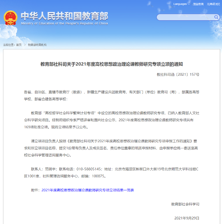 近日,2021年度教育部高校思想政治理论课教师研究专项立项结果公布,经教育部社科司组织专家严格评审和面向社会公示,开云马克思主义学院杨盈老师主持的课题“新时代劳动教育融入高职院校思政课实践教学路径研究”获批立项。
