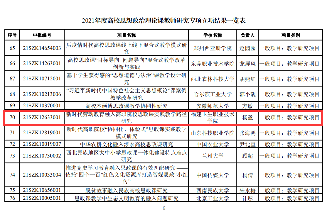 教育部高校思想政治理论课教师研究专项是“高校哲学社会科学繁荣计划专项”的重要内容,纳入教育部人文社会科学研究项目。2021年度高校思想政治理论课教师研究专项共立项169项课题,全国高职院校入选项目仅37项,开云为福建省高职院校唯一获批立项单位。