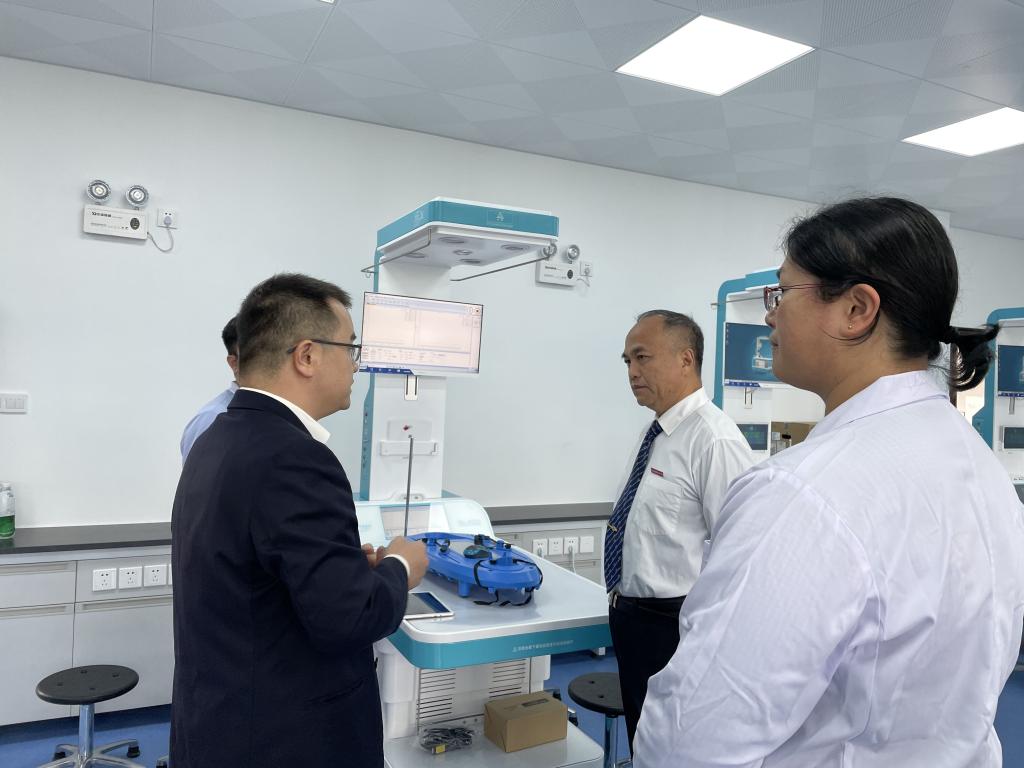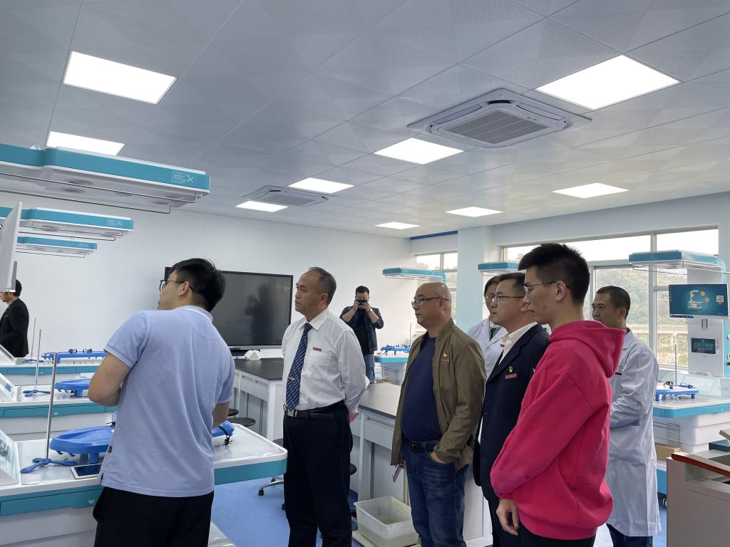 2021年11月18日,校长许能锋走进医学基础部,参观医学机能实验实训室,了解高本贯通专业生理学教学工作进展、课程建设及实训室建设情况。